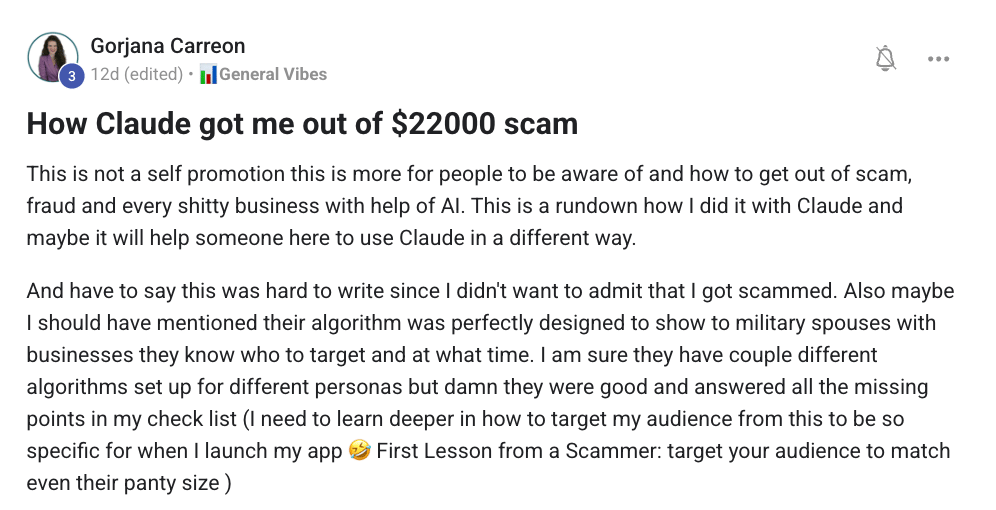 #5 How Claude helped Gorjana Carreon get out of a $22,000 scam - Gorjana shares a raw, vulnerable story of how she used AI to escape a sophisticated scam. Beyond the personal win, she breaks down the scammer's targeting techniques, turning a painful experience into valuable lessons about audience targeting and evidence documentation for others. Here is the detailed breakdown.