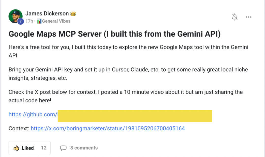I have shared the entire MCP setup and code inside The Vibe Marketers community where over 2,500 marketers are already experimenting with it to build their own local-intelligence and lead-gen systems.