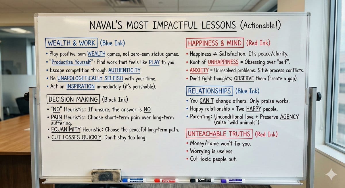 Example: I summarized Naval's most impactful lessons on wealth, life, and happiness from a 3+ hour podcast into a whiteboard lesson type visual