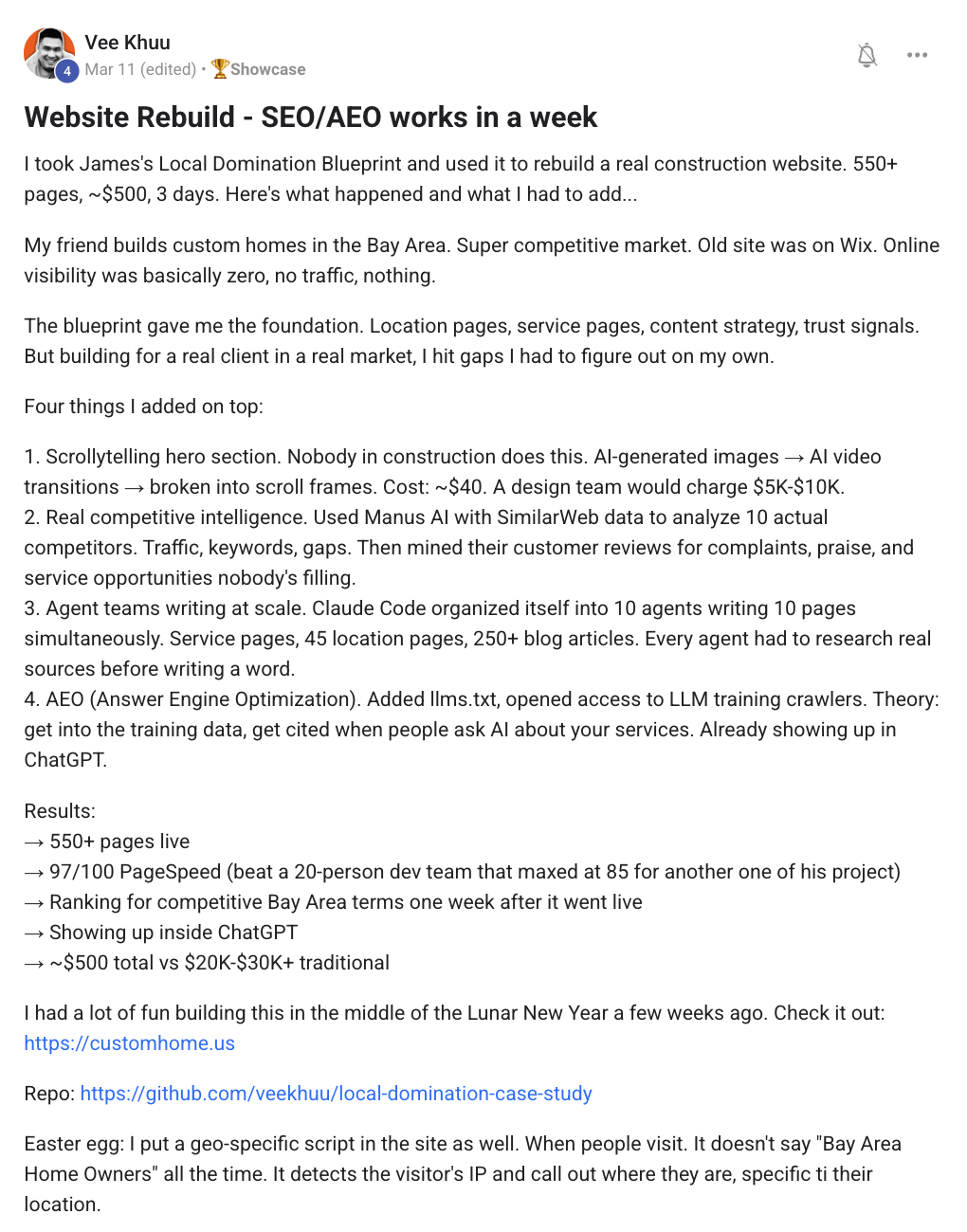 #2 Rebuilding a 550-page site in days - Vhee Khu used my local domination SEO blueprint + Claude Code agents to rebuild a construction website from zero visibility to 550+ pages in under a week. Starting from a basic Wix site, he scaled service, location, and blog pages in parallel, layered in competitor intelligence, and optimized for both Google and AI search (AEO). Here’s his case study…