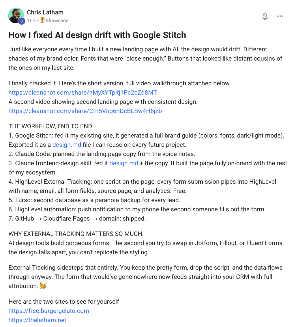 #4 Fixing AI design drift with Google Stitch - Chris Latham breaks down how he turned inconsistent AI landing page builds into a repeatable branded system. Instead of dealing with off-brand colors, mismatched fonts, and forms that ruined the design, he used Google Stitch to generate a reusable brand guide from his existing site, then combined it with Claude Code and a frontend design skill to build new pages that matched the rest of his ecosystem. He also solved the form problem with HighLevel external tracking, added Turso as a backup for every lead, set up instant notifications, and shipped through GitHub and Cloudflare Pages.