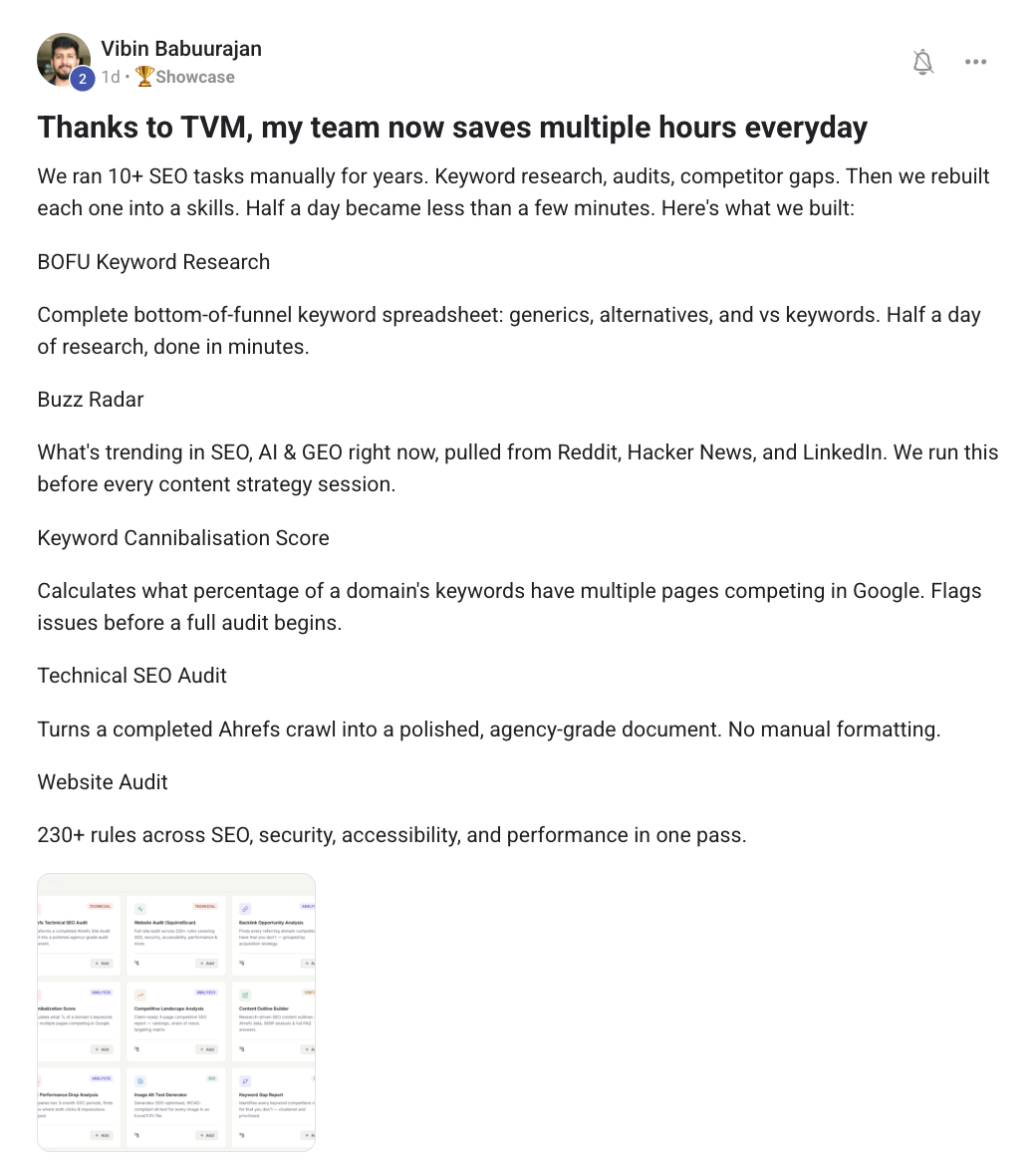 #3 Turning daily SEO work into reusable skills - Vibin Babuurajan shows how his team took 10+ SEO tasks they used to do manually like BOFU keyword research, trend tracking, keyword cannibalization checks, technical audits, and full website audits and rebuilt them into repeatable skills. Work that used to take hours each day now runs in minutes, turning manual SEO execution into a faster, more scalable system.