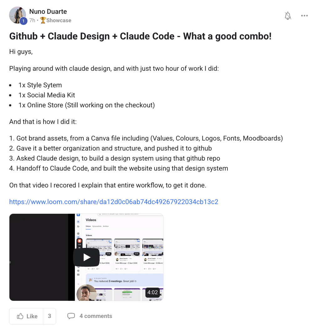 #1 From brand assets to full product in hours — Nuno Duarte walks through how he used GitHub + Claude Design + Claude Code to go from raw brand files to a working digital product. Starting with a messy Canva file (values, colors, logos, fonts, moodboards), he structured everything into a clean system, pushed it to GitHub and used Claude Design to generate a full design system. From there, Claude Code handled the build, shipping a social media kit, style system and even an online store…