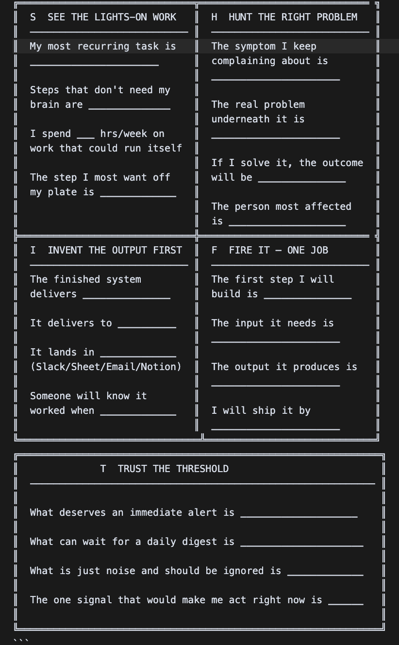 Before touching any tool what does the finished system deliver? To who? Where? Work backwards from that. Every decision upstream flows from this.